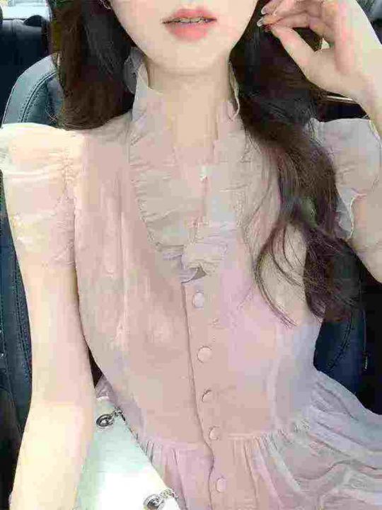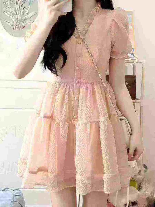☕️仙女连衣裙纯欲温柔风法式v领粉色女甜美连衣裙夏...