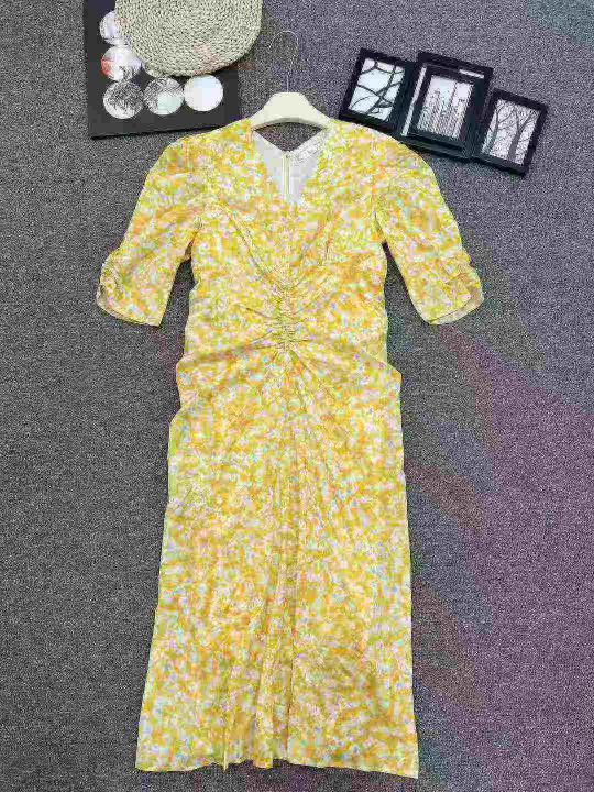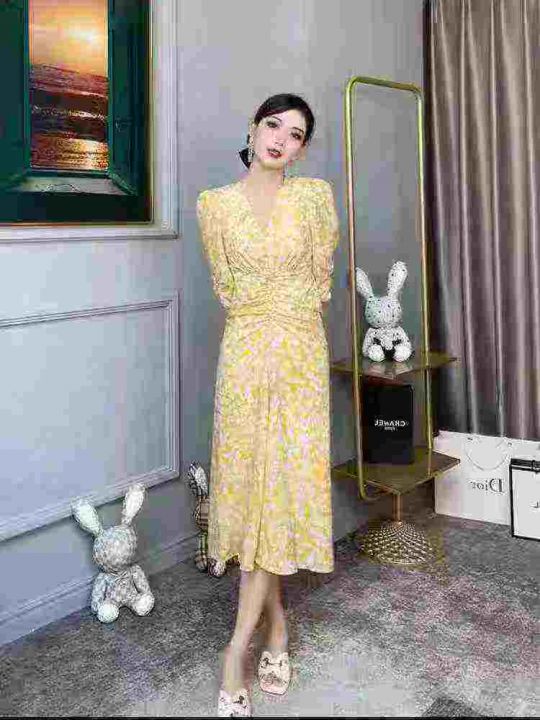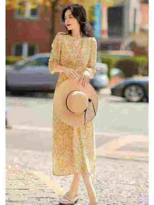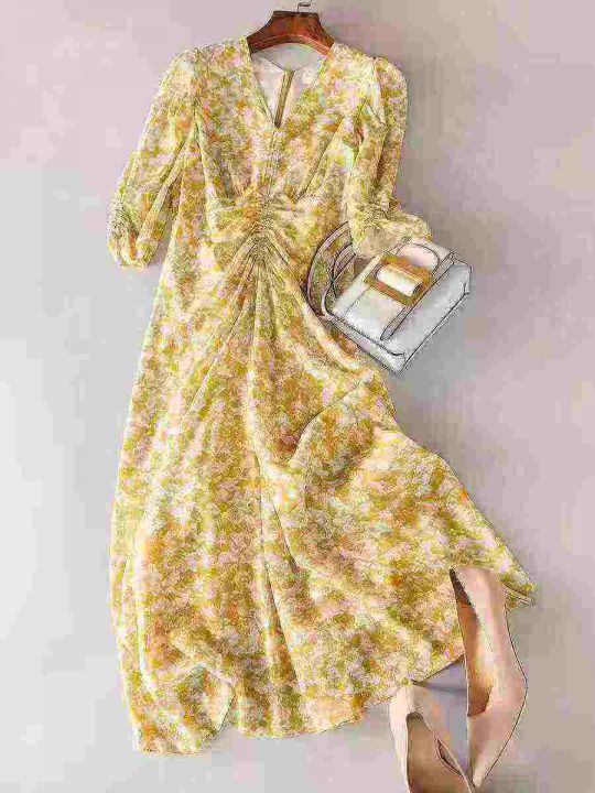 茶歇法式黄色V领碎花连衣裙女夏气质优雅温柔风修身收腰长裙