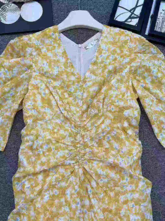 ☕️整款连衣裙茶歇法式黄色V领碎花连衣裙女夏气质优...