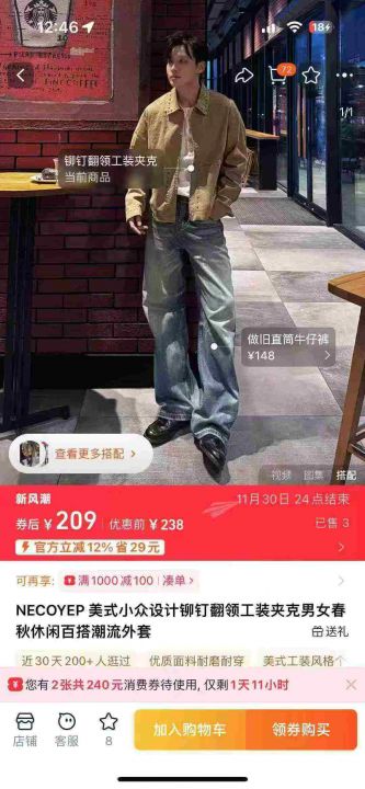 180件美式小众设计顶珠翻领工装夹克棉服休闲百搭潮流...