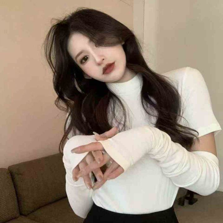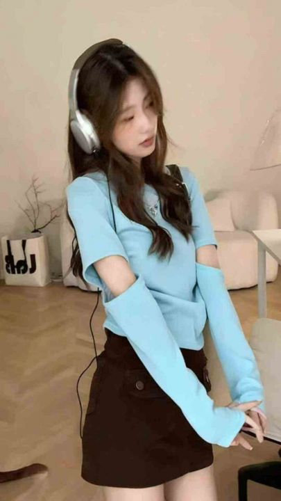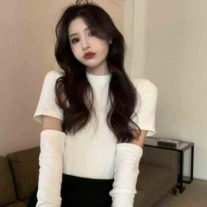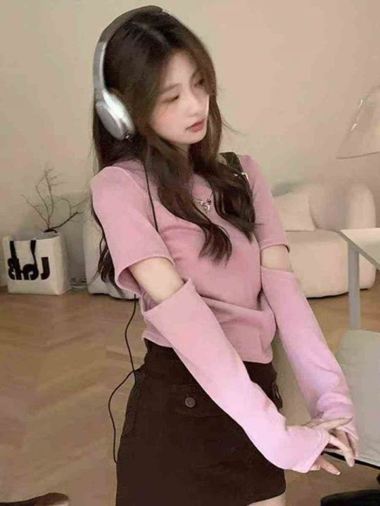 春夏新款辣妹设计感纯色可拆卸长短袖2穿针织套头毛衣...