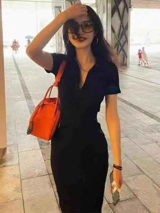 [月亮]:11.8清75件(不分货)[月亮]:赫本风深V Polo修身包臀针织毛衣连衣...