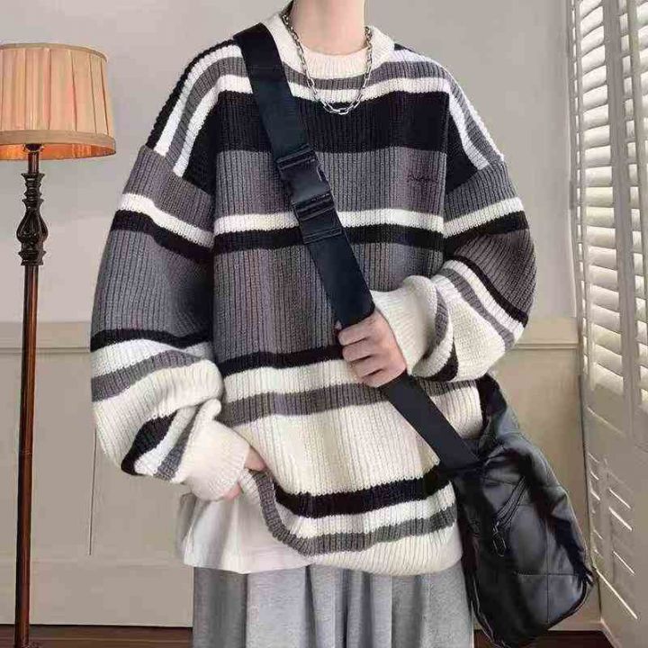 秋冬季慵懒风情侣百搭条纹宽松圆领毛衣,男女同款,10...