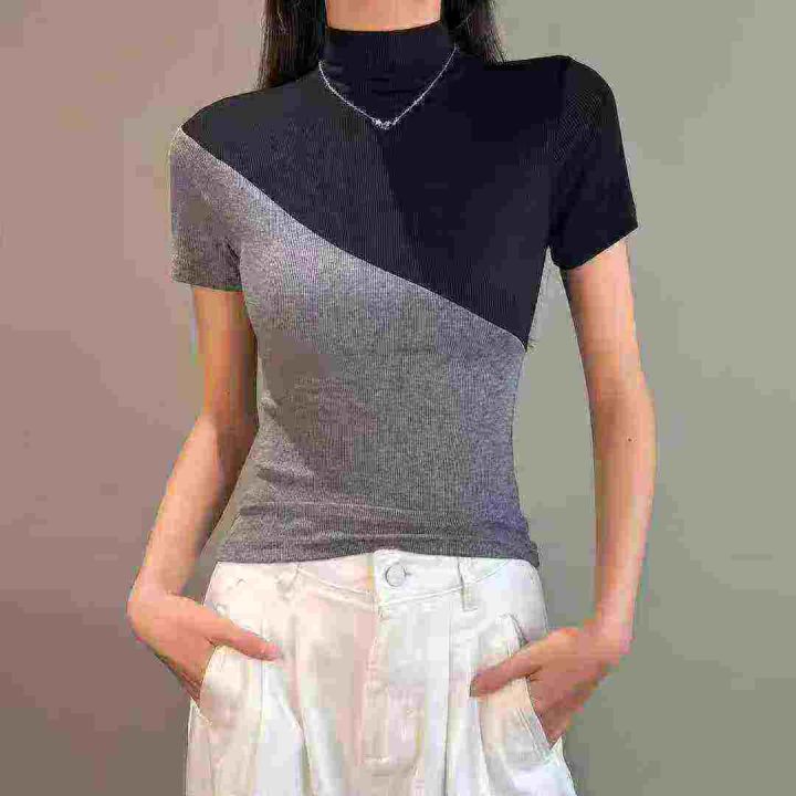天猫在售款188件左右高品质夏季半高领拼色螺纹短袖T恤,单款单色,高弹力,码数S-XL,独立包装带吊牌