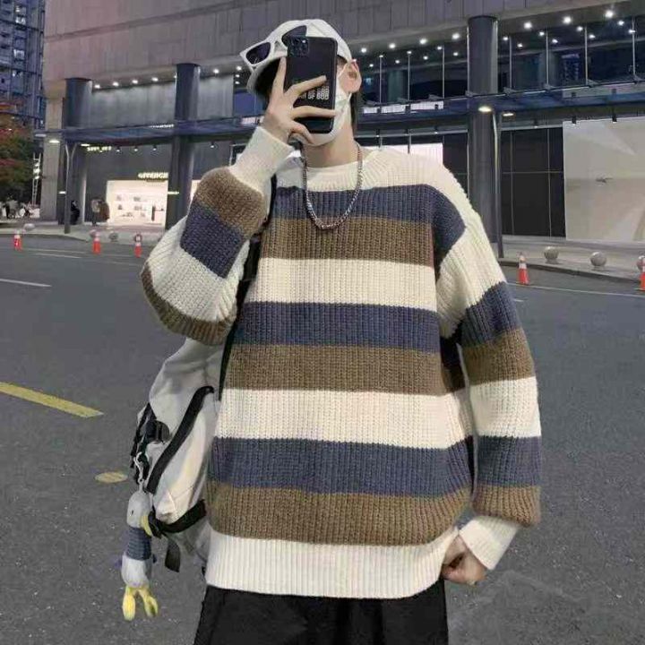 秋冬季慵懒风情侣百搭条纹宽松圆领毛衣,男女同款,10...
