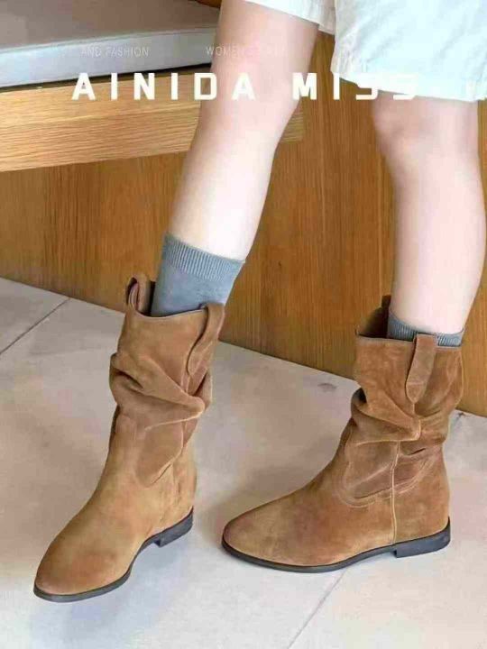 牛皮版~法式尖头西部牛仔靴女2025新款冬季短筒堆堆靴...