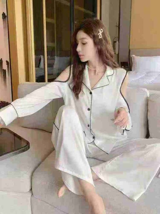 ① 网红爆款冰丝性感长袖长裤睡衣两件套装!整款两色,...