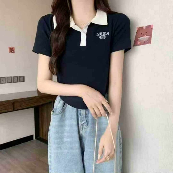 美式polo领短袖T恤女夏季新款设计复古辣妹修身显瘦短款上衣ins潮,s一3XL码,主要是黑色多,纯棉质量好,防水袋装,1580件。全清4.8块,分货加一