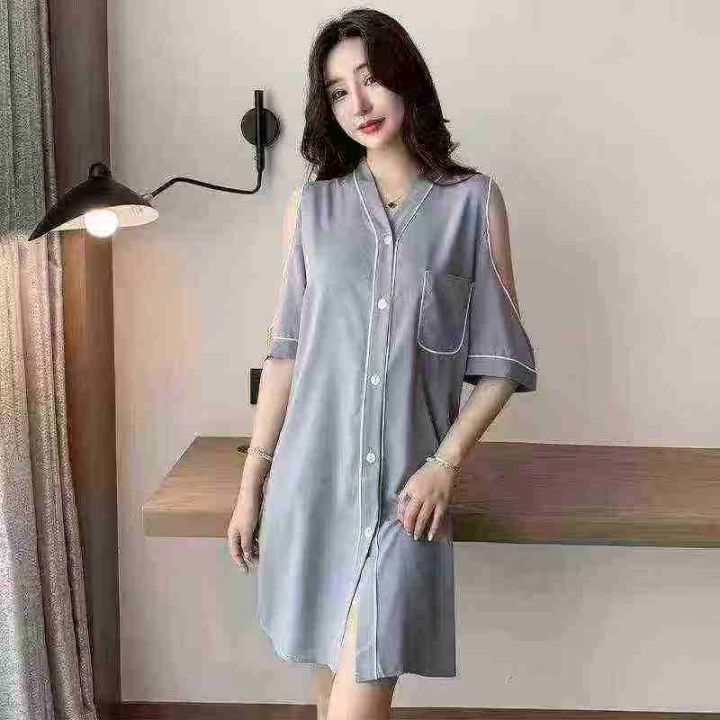 ① 网红冰丝性感露肩韩版宽松家居睡裙!独立包装,整...
