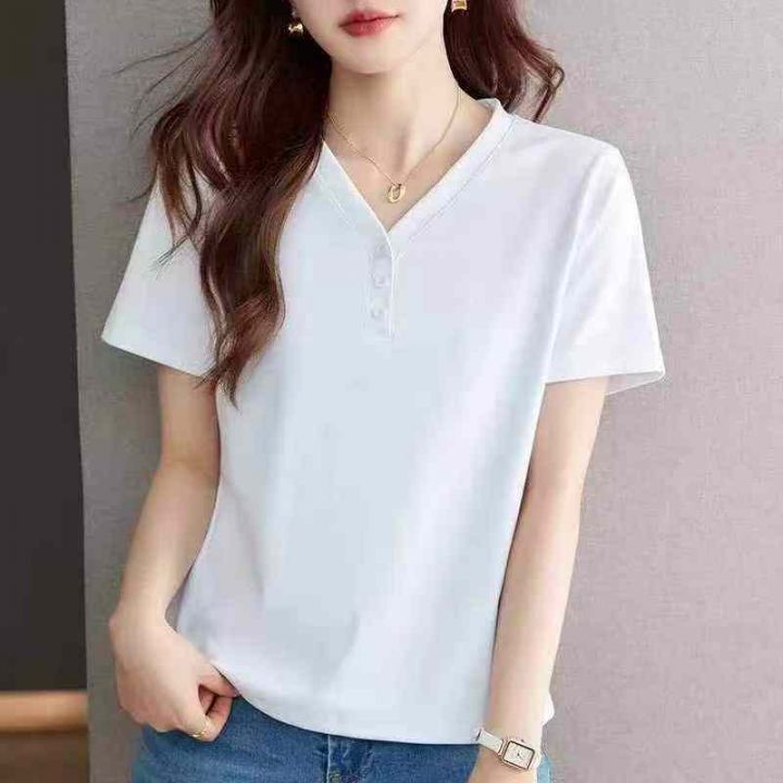 [月亮]:夏季新款纽扣V领休闲短袖T恤