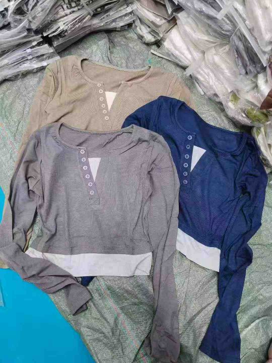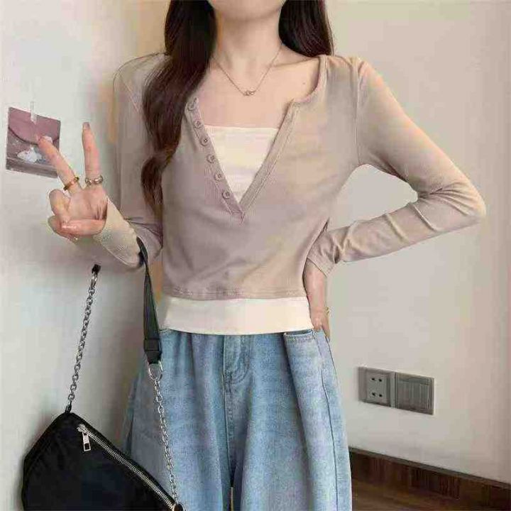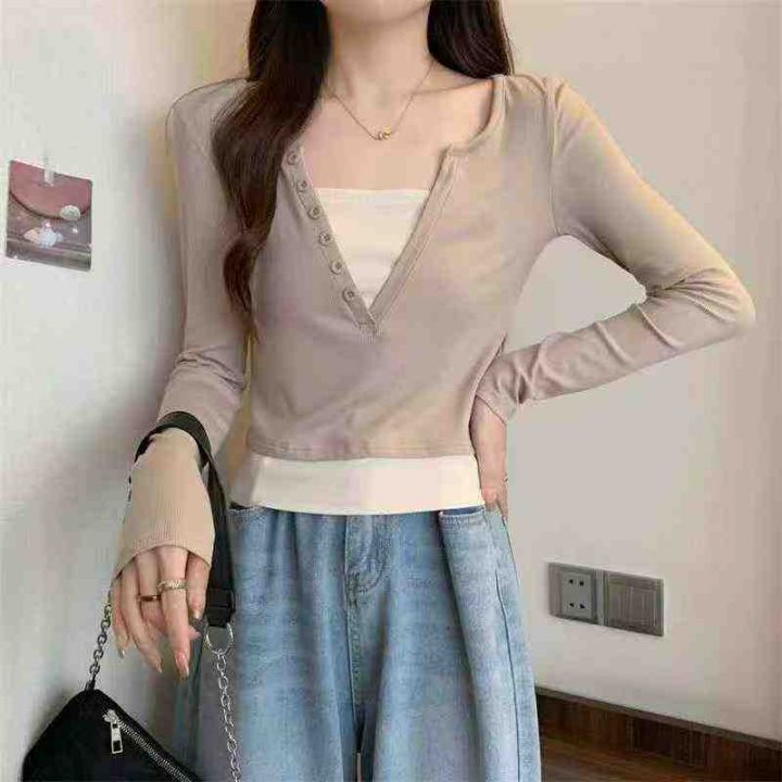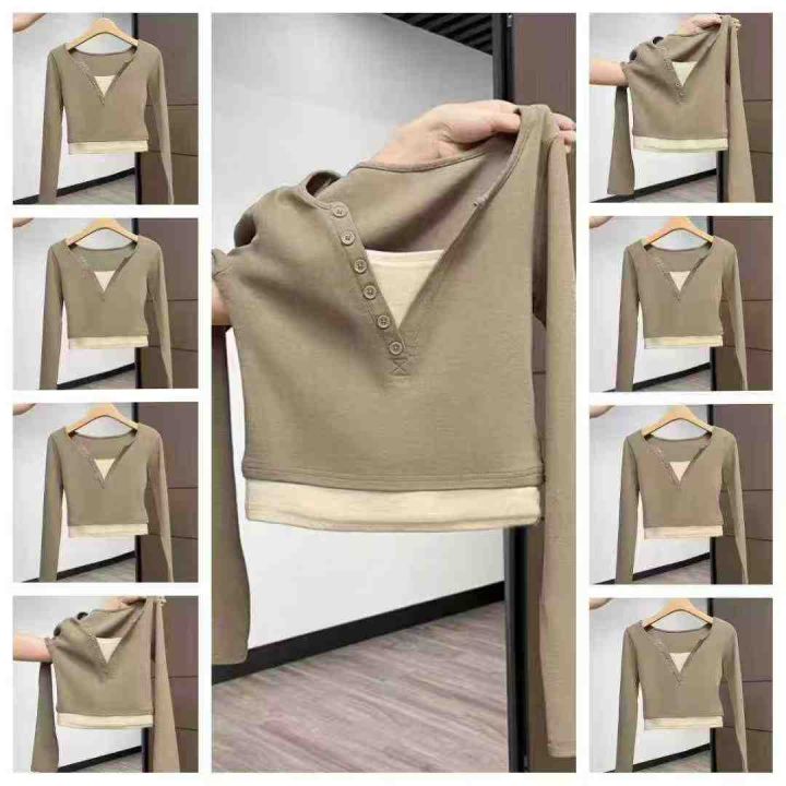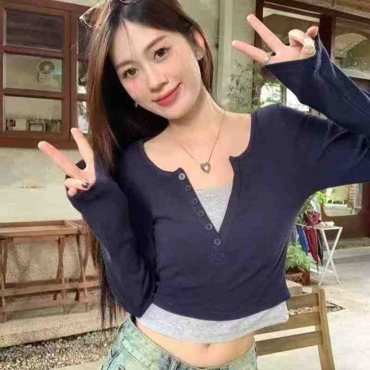 [發]撞色假两件辣妹纽扣v领长袖70件