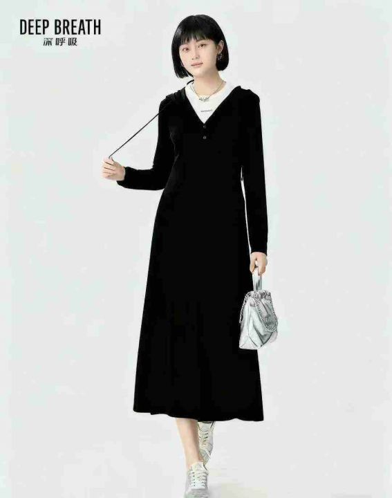 新款法式连帽连衣裙气质修身长袖长裙,高弹力,领口包...