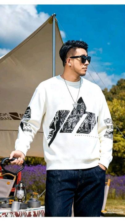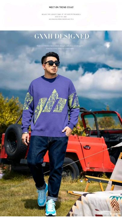 秋冬新款男士潮牌宽松慵懒风提花包芯纱圆领套头毛衣,...