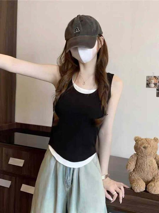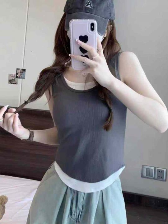 工厂回收500件辣妹复古带胸垫高弹力小众设计感假两件背心,码数M-L码。版型质量很好,面料柔软舒适有弹力,固定杯胸垫不走位,独立包装。分货➕0.5。 货号:1323