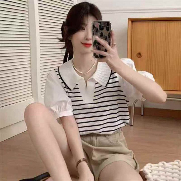夏季新款冰丝条纹Polo领假两件雪纺拼接袖针织短袖T桖...