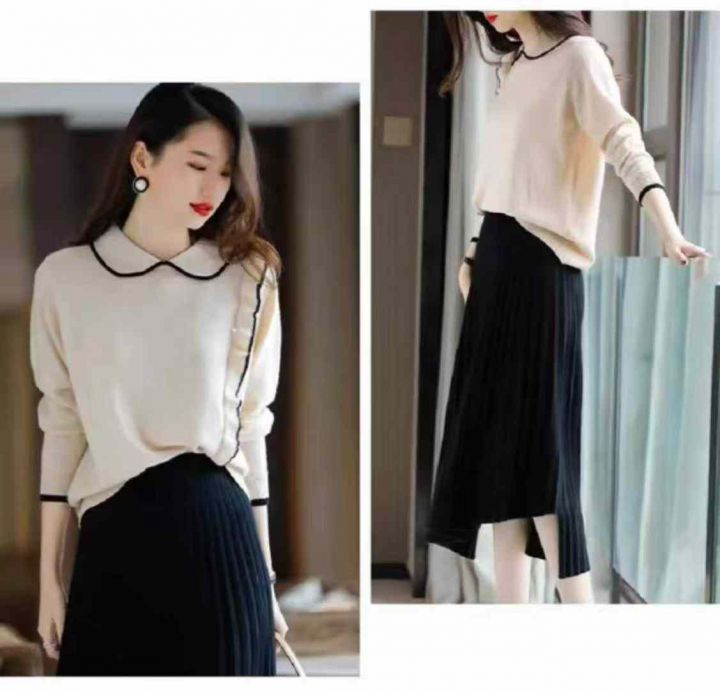 秋冬新款韩系温柔风撞色翻领长袖包芯纱套头毛衣,面料...