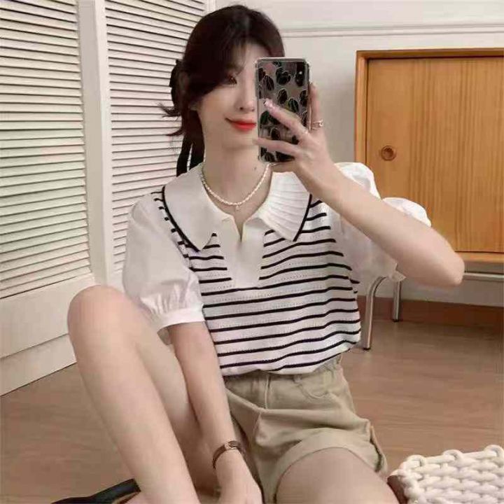 夏季新款冰丝条纹Polo领假两件雪纺拼接袖针织短袖T桖,独立包装,均码面料柔软舒适弹力大,150件,全清6.9元超低价秒杀!