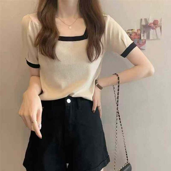 夏季新款大码宽松弹力显瘦方领冰丝针织短袖,独立包装,均码面料柔软舒适弹力,宽松版,单款4色米色黑色多,4600件,全清5.9元超低价秒杀!分货加一!