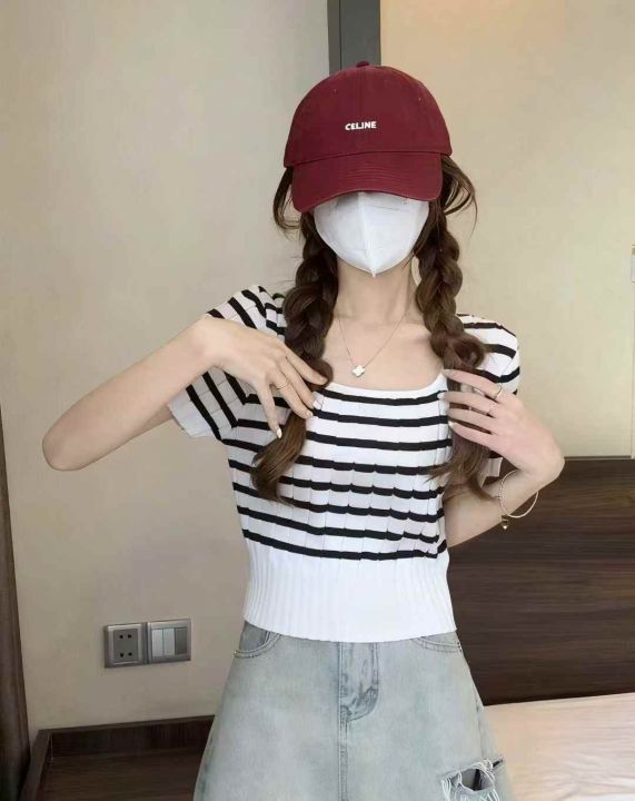 夏季新款撞色条纹甜美方领设计感短袖针织T桖,独立包...