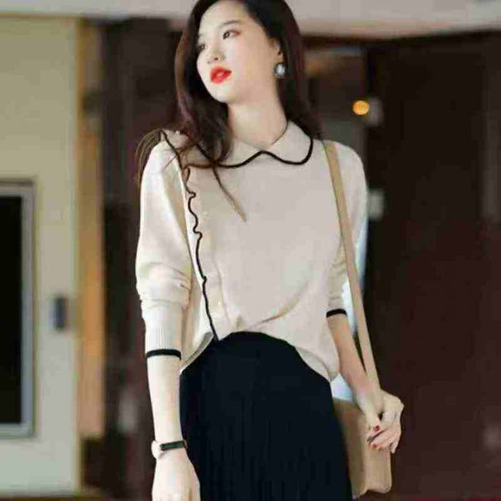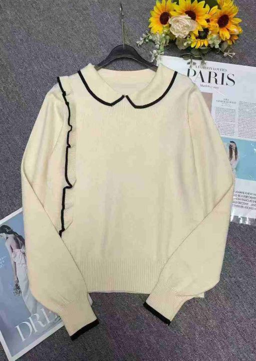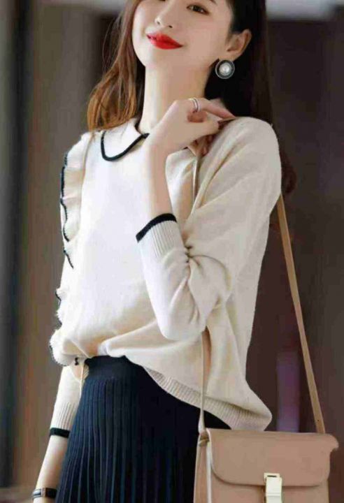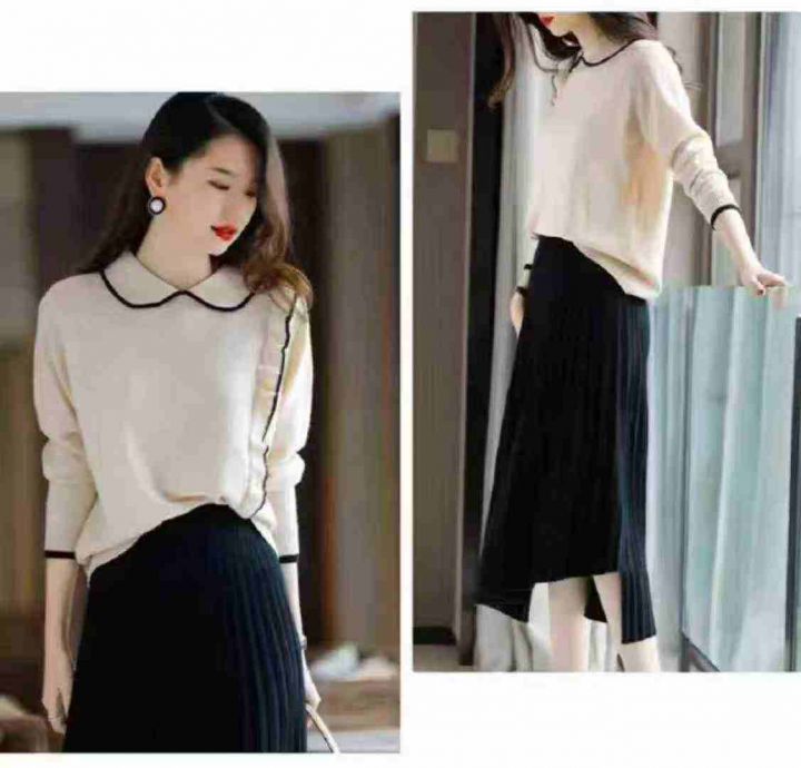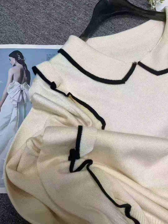 秋冬新款韩系温柔风撞色翻领长袖包芯纱套头毛衣,面料...