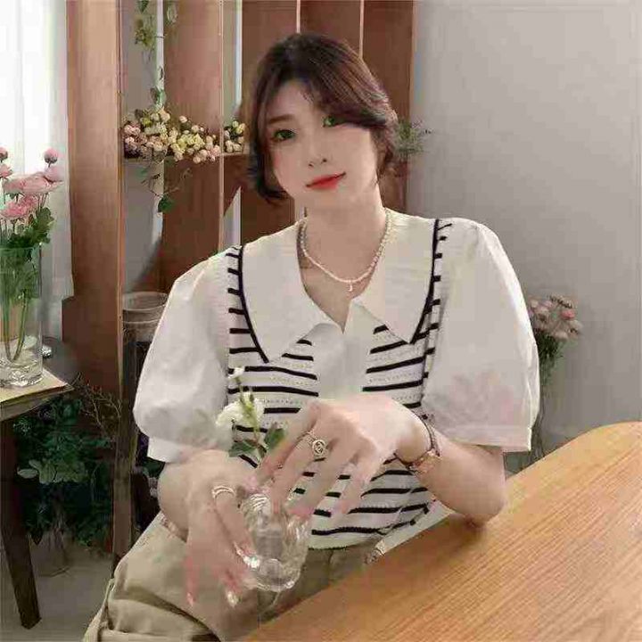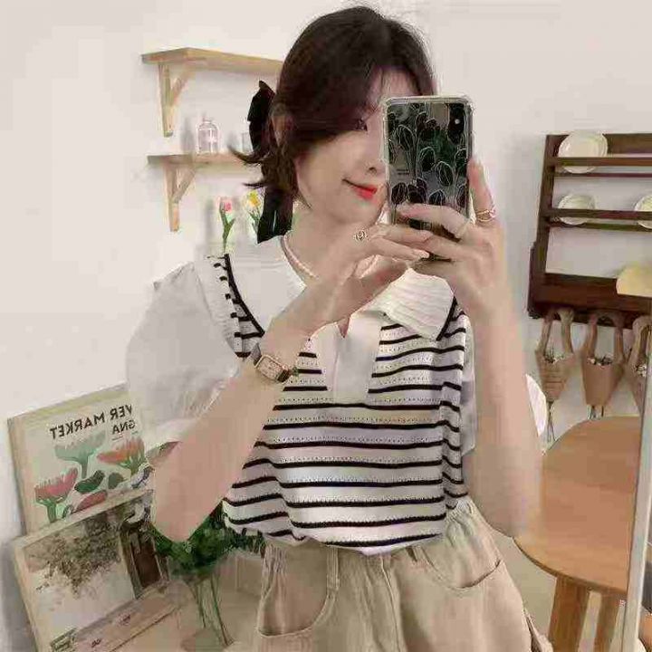 夏季新款冰丝条纹Polo领假两件雪纺拼接袖针织短袖T桖...