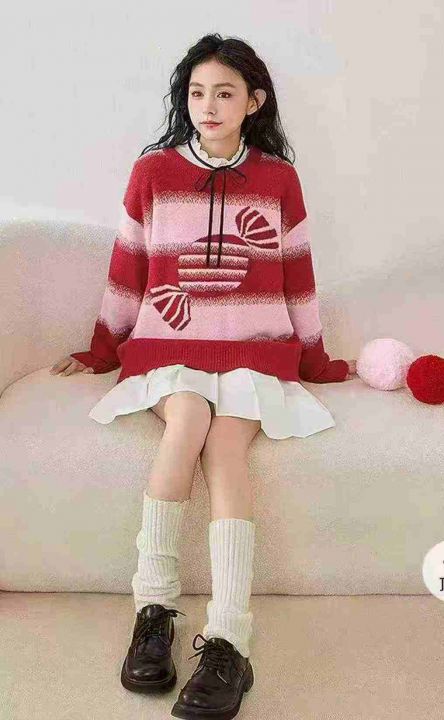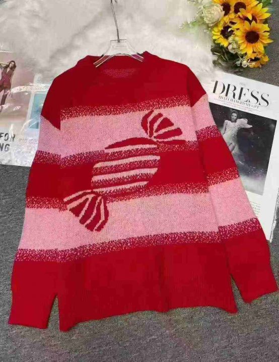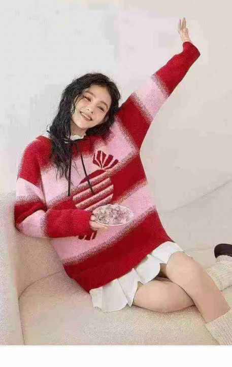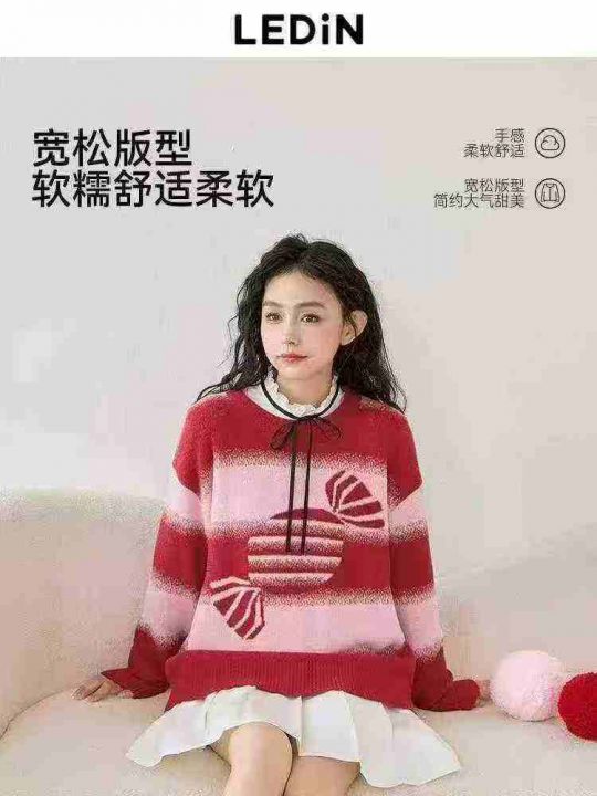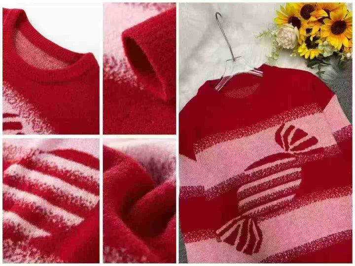 秋冬新款宽松慵懒风乐町草莓奶糖新年红氛围感包芯纱提花钻进套头毛衣,独立包装,均码面料软糯厚实,300件,全清9.9元超低价秒杀!分货加一!
