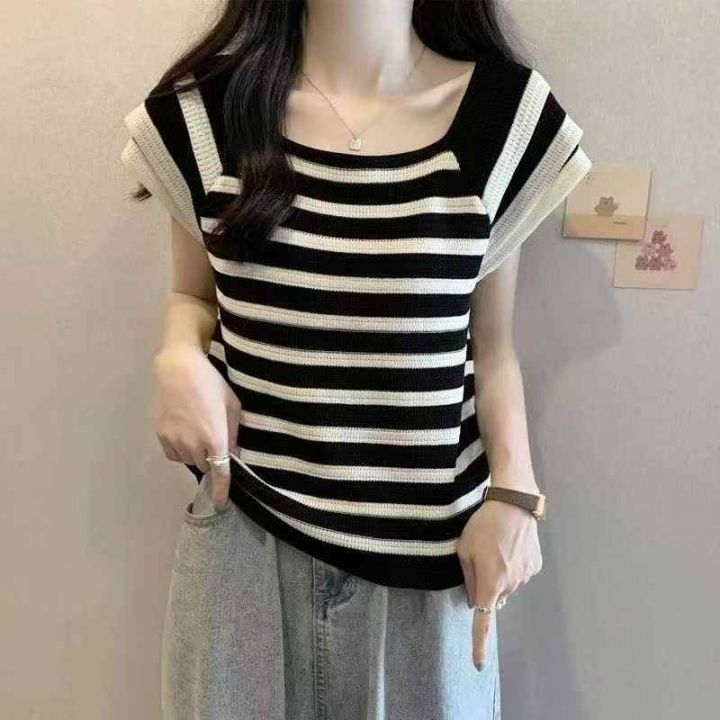 夏季新款气质层次感飞飞袖甜美减龄撞色条纹针织T桖,...