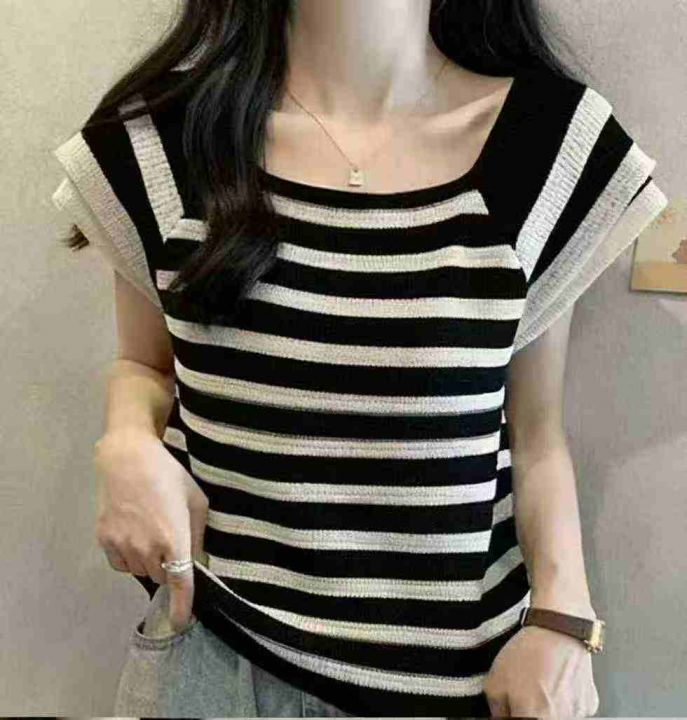 夏季新款气质层次感飞飞袖甜美减龄撞色条纹针织T桖,...