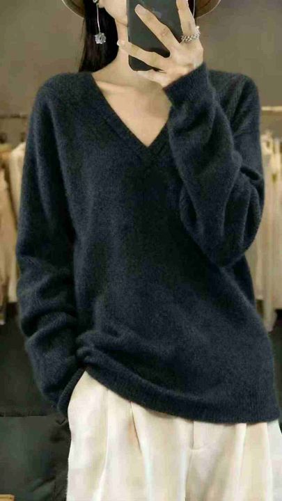秋冬新款宽松慵懒风V领包芯纱套头毛衣,独立包装,均...