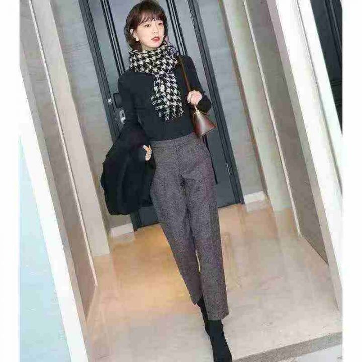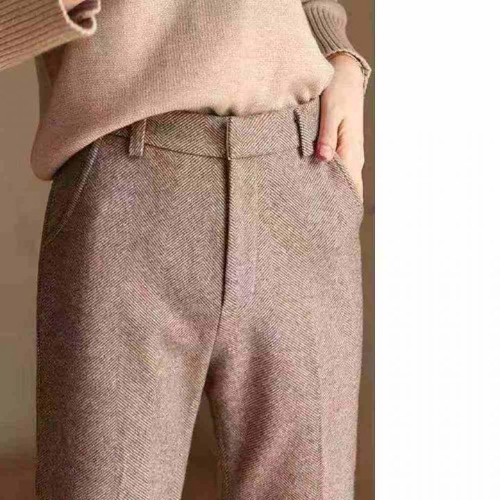 女裤2025秋冬棕咖色深灰色人字纹毛呢西裤女九分烟管裤...