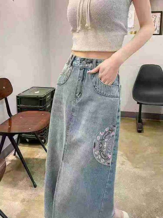 中国风宽松显瘦刺绣开叉长牛仔裙,单款单色2个长度,...