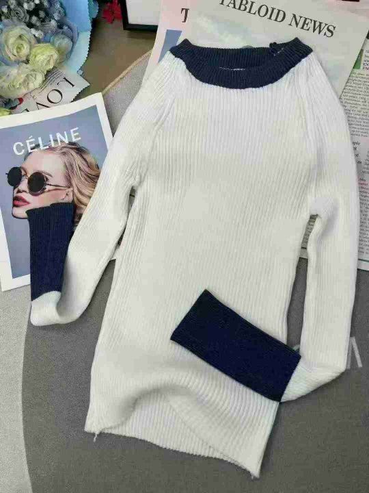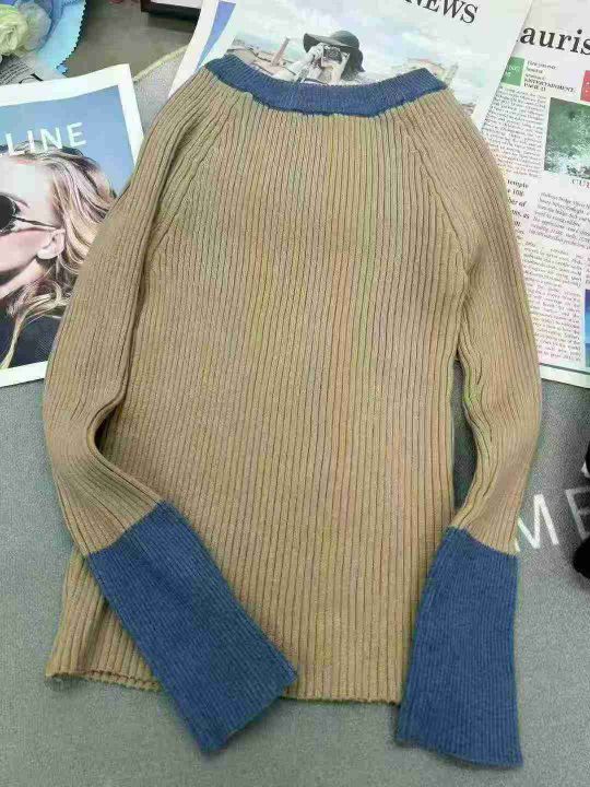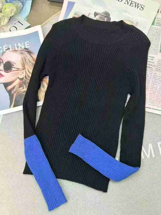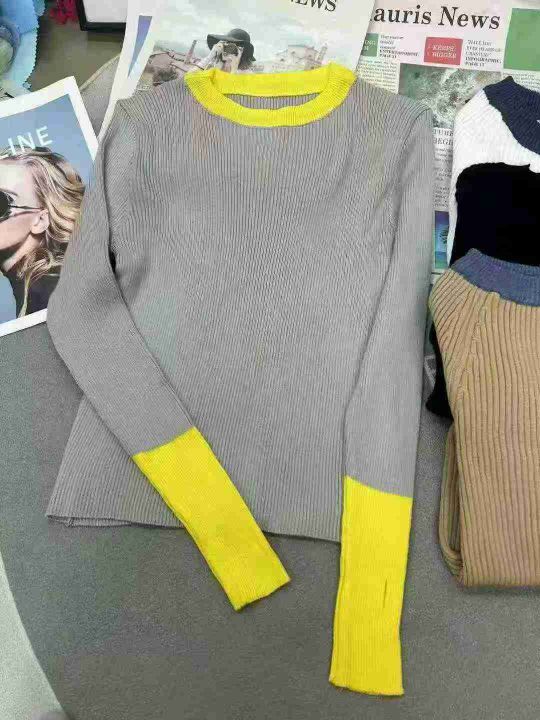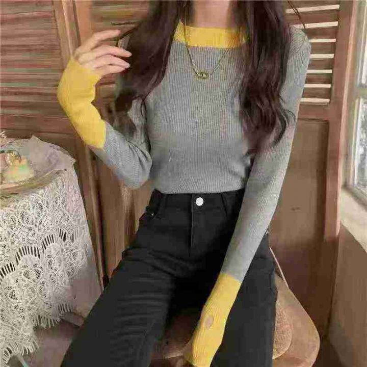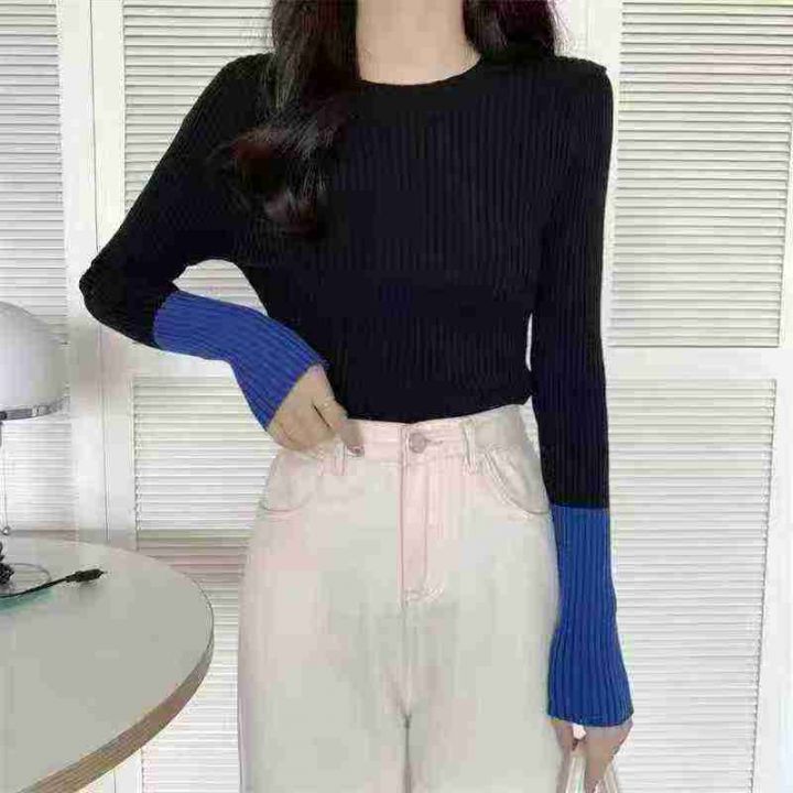 靓妹毛衣秋冬新款高弹力修身显瘦拼色圆领女士毛衣,独...