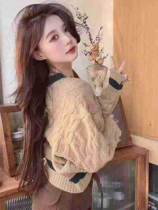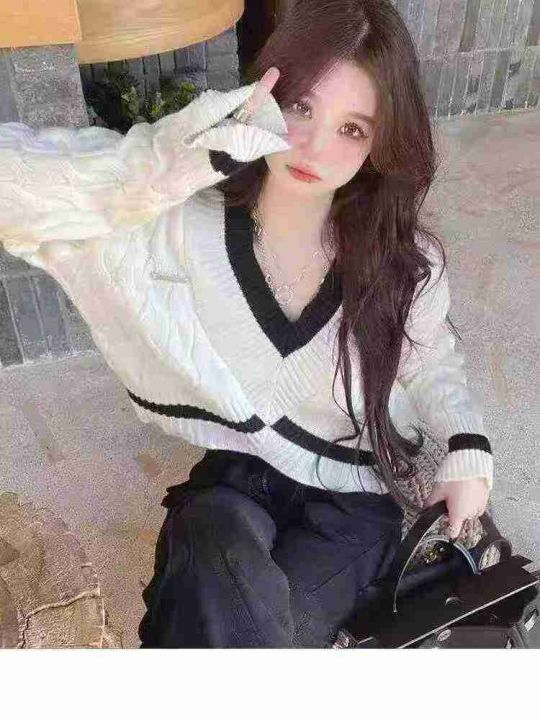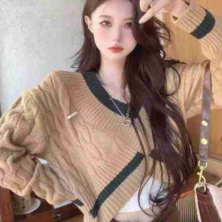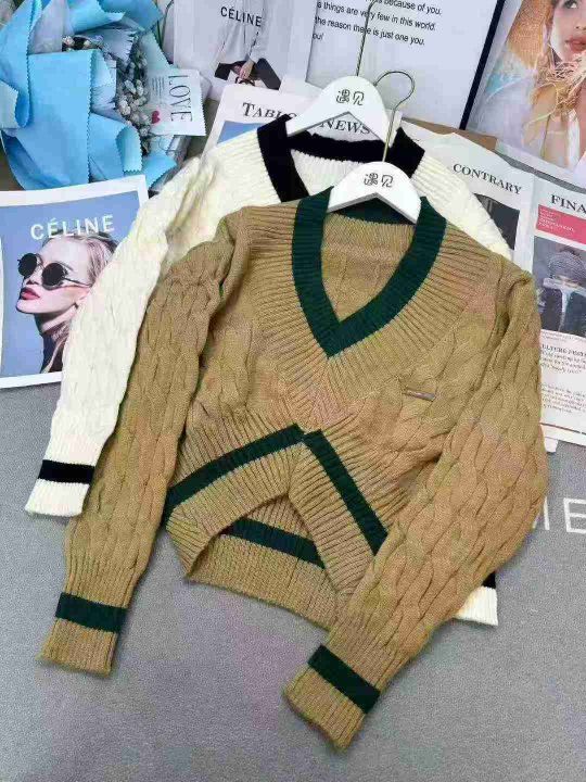 慵懒风爆款麻花短款显瘦设计V领毛衣,整款2色,数量24...