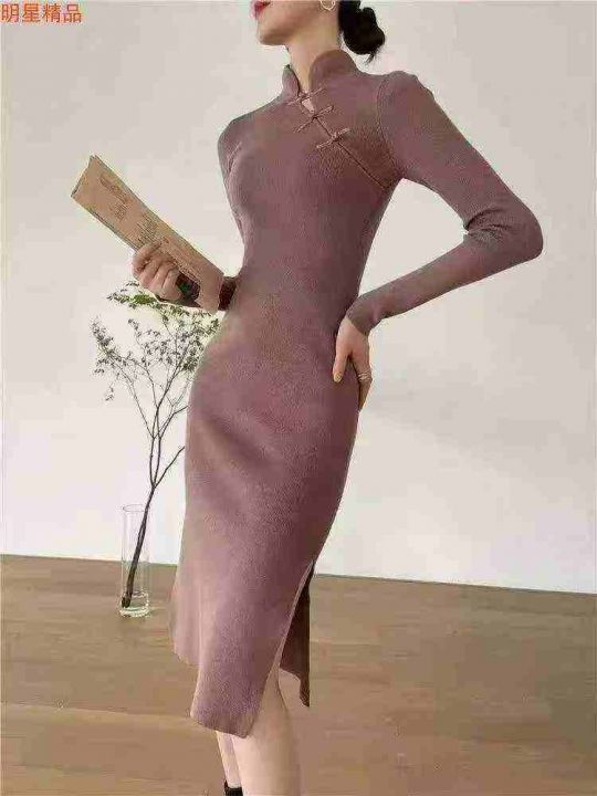 新中式国风盘扣旗袍毛衣连衣裙,女包臀开叉长裙,码数...