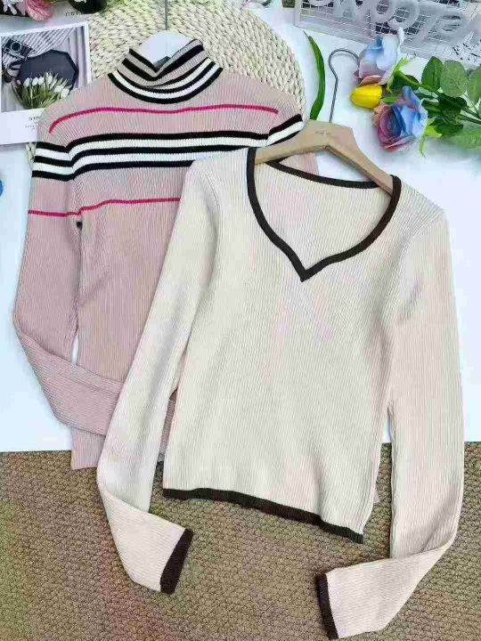 秋冬新款撞色条纹宽松Polo领套头毛衣,独立包装,均码面料柔软舒适弹力大,...