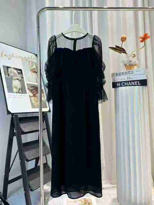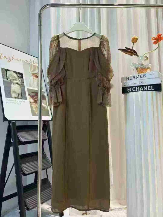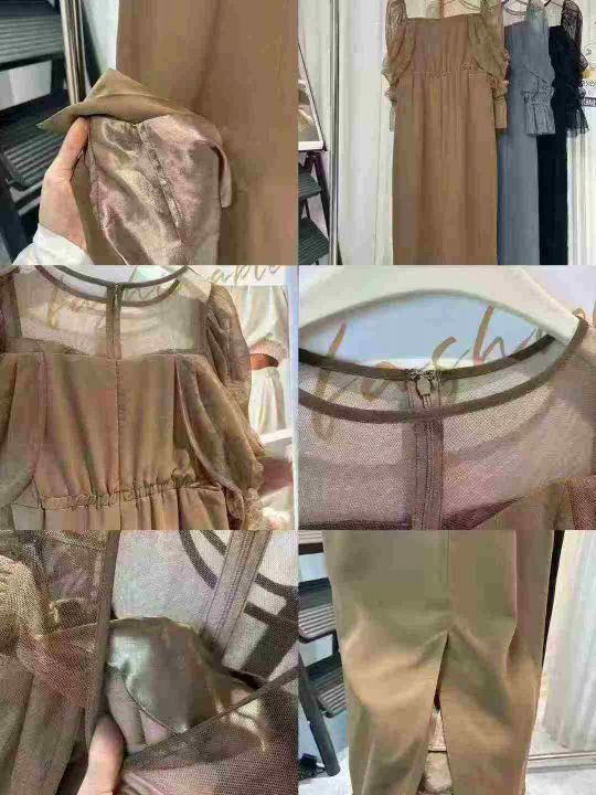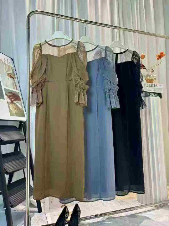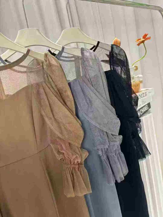 250条日单圆领拼接网纱微透喇叭袖收腰显瘦纯色开衩鱼尾连衣裙,质量超好!琉璃网纱微弹力不易勾丝,有内衬,尺码S-L,独立包装!全清17.8
