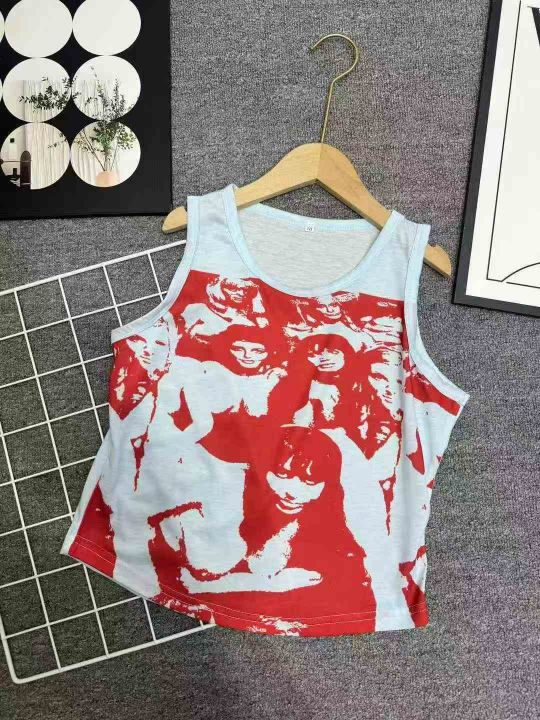 chic辣妹上衣 圆领修身短款复古撞色T恤 Y2K千禧风无袖印花背心夏,独立包装,码数XL-5XL,数量499件,全清3.8元,分货➕0.5
