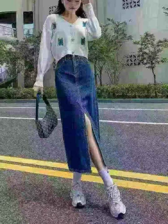 高腰显瘦前开叉牛仔中长款半身裙,单款两色,浅蓝色款...