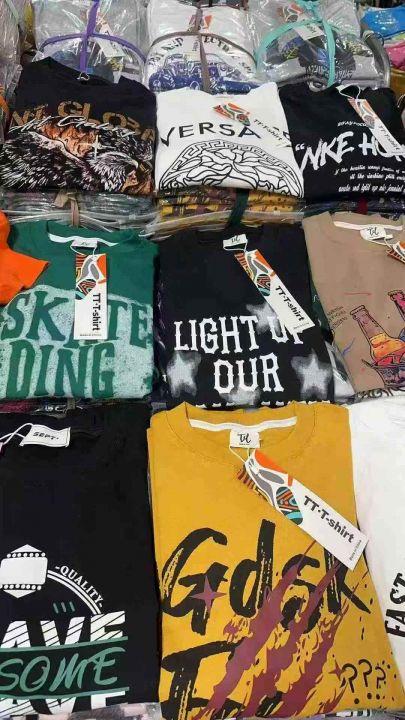 30000+欧版快时尚品牌潮牌系列高品质280-300克重磅纯棉罗拉大版露肩短袖T恤男女通款颜色花型多新货当尾货价格批发工厂直销。 货号:1303