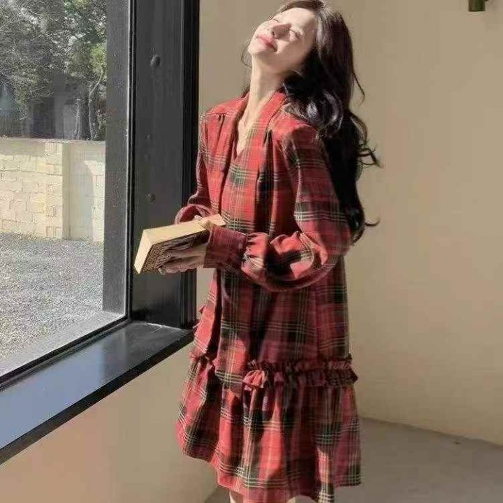 复古格子连衣裙121件9.9,翻领荷叶边,褶皱拼接,码标...