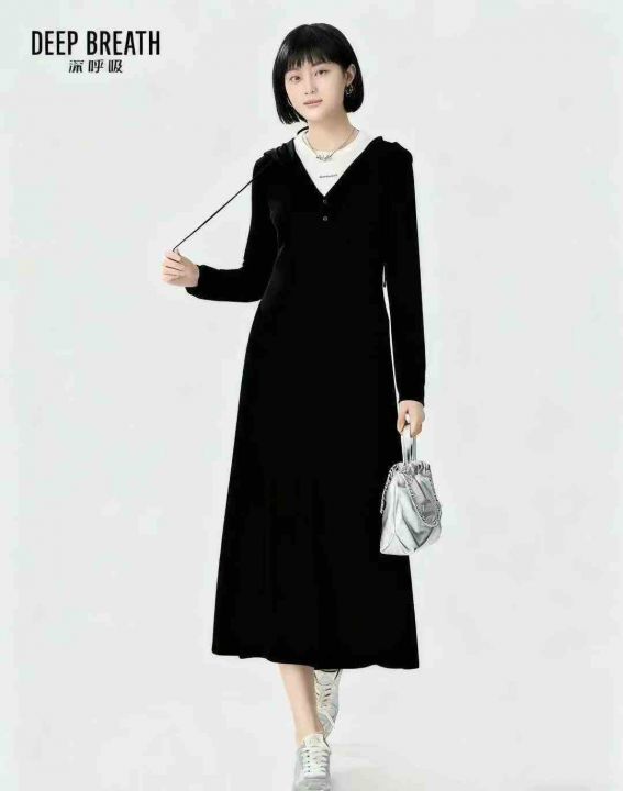 新款法式连帽连衣裙气质修身长袖长裙,高弹力,领口包...