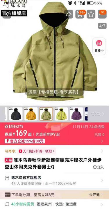 天猫在售款啄木鸟同款三防面料男女同款户外软壳冲锋衣1100件,单款3色,码数S-XL,独立包装,福建货,工厂订单超时退单,面料成本60多块人工成本20多,质量嘎嘎好,有清单