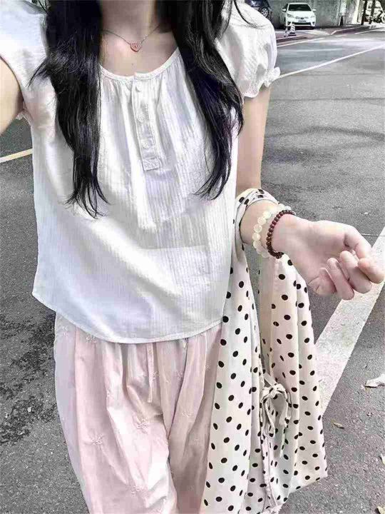 [月亮]:甜美泡泡袖纽扣白色辣妹衬衣上衣