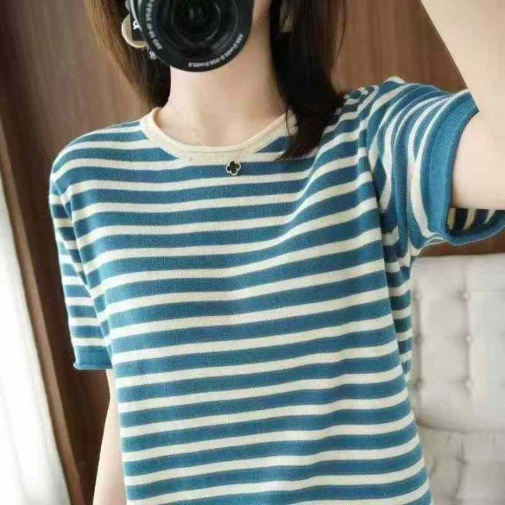 夏季新款圆领撞色条纹宽松百搭半袖针织衫,独立包装,...