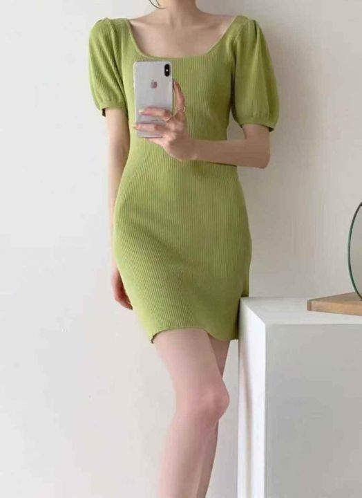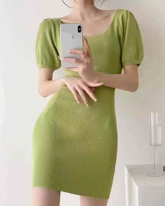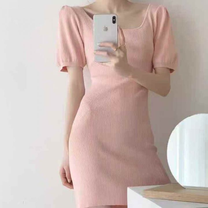 夏季新款法式减龄泡泡袖短袖弹力修身显瘦针织连衣裙,...