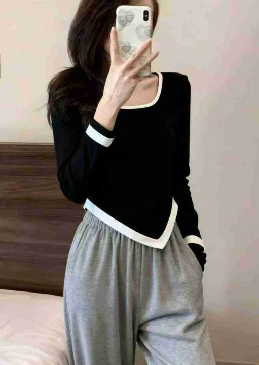 秋冬新款撞色高腰设计不规则纯欲风短款针织套头毛衣,...