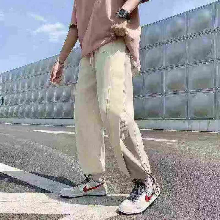 523条,港风休闲裤女2025夏季新款宽松阔腿裤薄款抽绳束脚拼接学生运动裤,...
