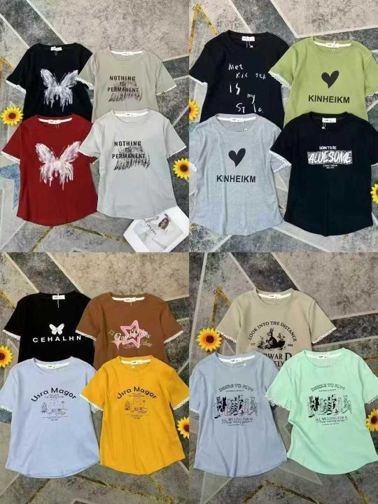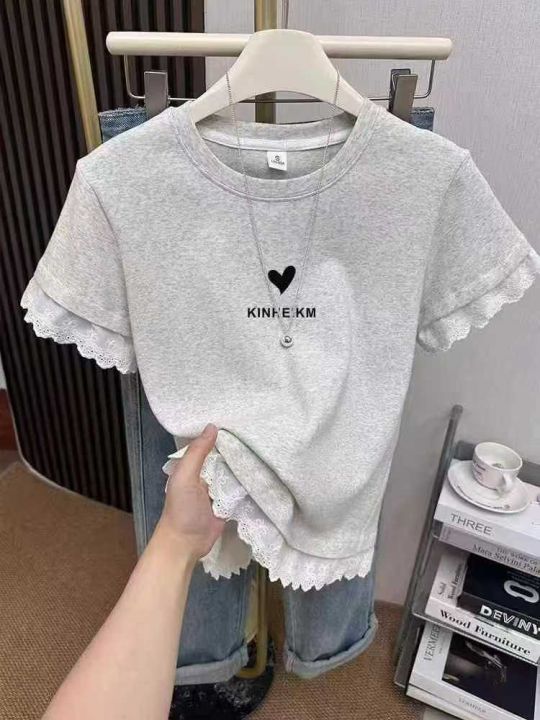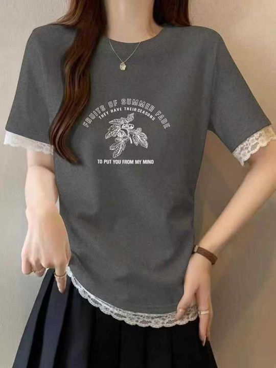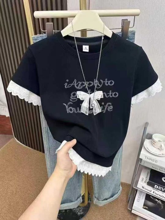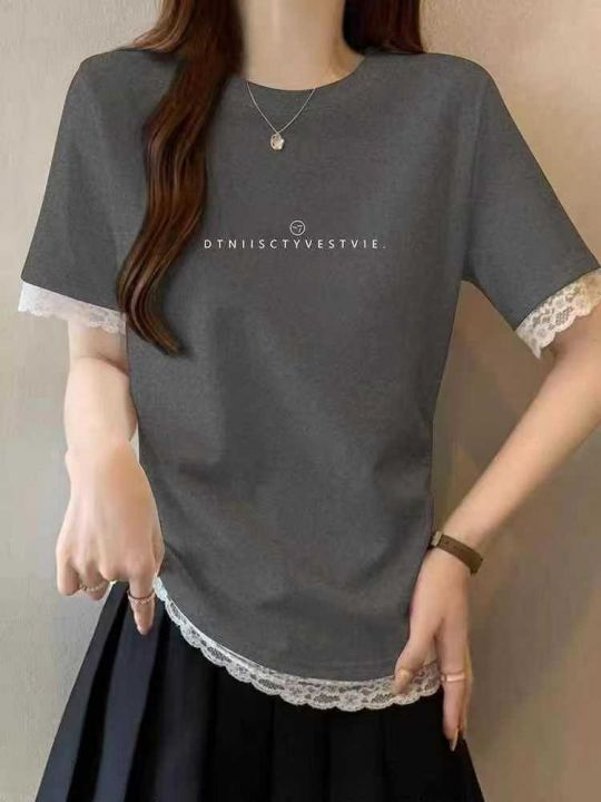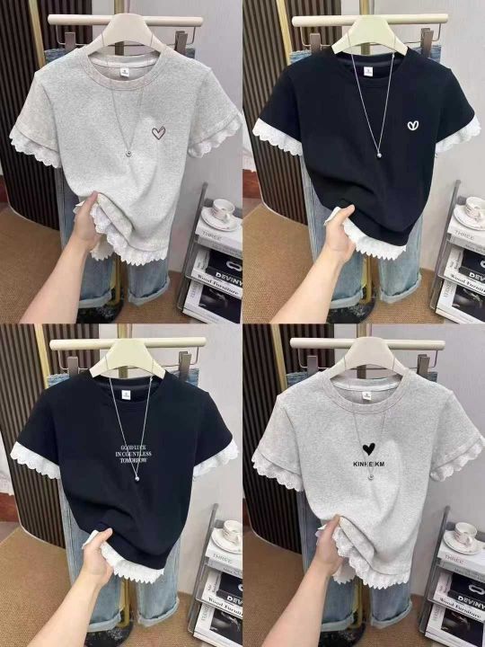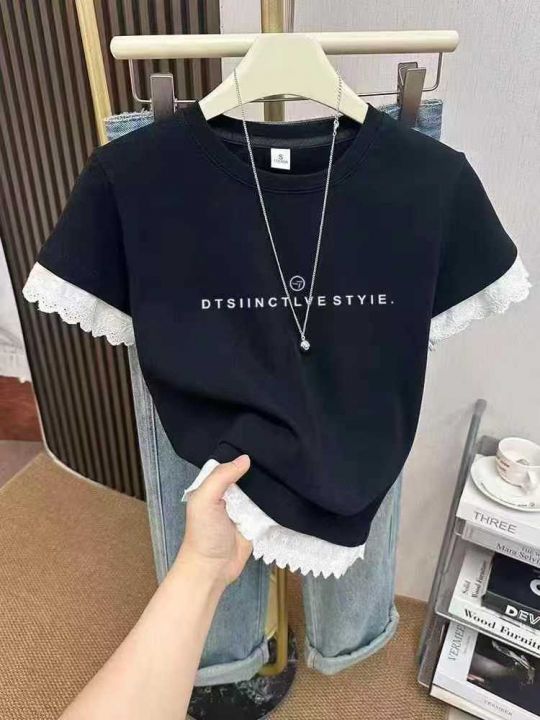 纯棉质量,均码高弹力,小整多花型颜色。正肩蕾丝纯棉短袖t恤女新款时尚休闲洋气不撞款半袖上衣