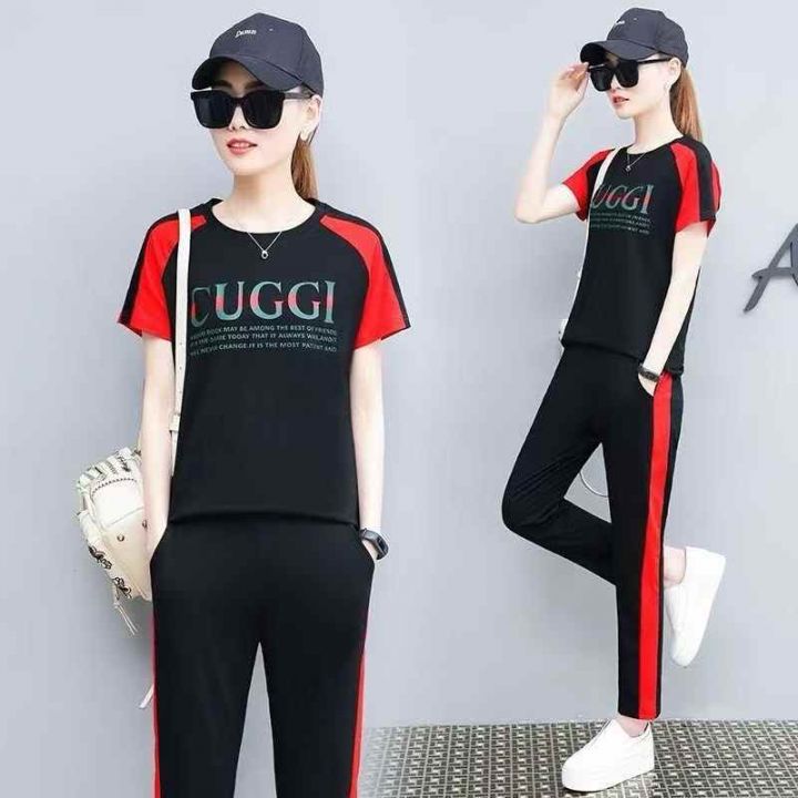 短袖长裤运动套装女夏时尚纯棉宽松跑步服休闲两件套,...