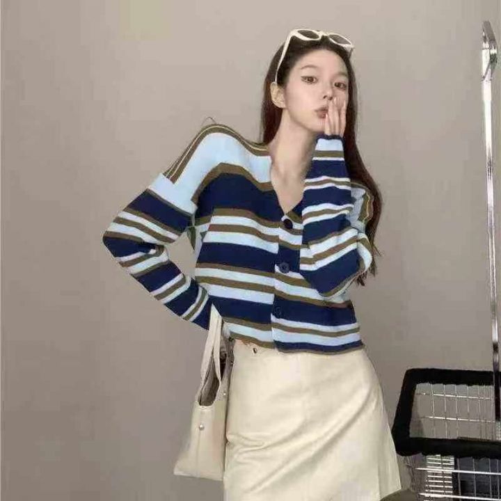 秋季新品软糯撞色条纹宽松慵懒风百搭针织毛衣开衫,独...